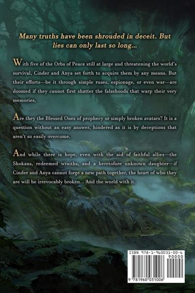 Many truths have been shrouded in deceit. But lies can only last so long... With five of the Orbs of Peace still at large and threatening the world's survival, Cinder and Anya set forth to acquire them by any means. But their efforts-be it through simple ruses, espionage, or even war-are doomed if they cannot first shatter the falsehoods that warp their very memories. Are they the Blessed Ones of prophecy or simply broken avatars? It is a question without an easy answer, hindered as it is by deceptions that aren't so easily overcome. And while there is hope, even with the aid of faithful allies-the Shokans, redeemed wraiths, and a heretofore unknown daughter-if Cinder and Anya cannot forge a new path together, the heart of who they are will be irrevocably broken... And the world with it.