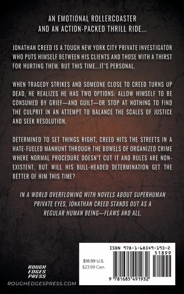 An emotional rollercoaster and an action-packed thrill ride... Jonathan Creed is a tough New York City private investigator who puts himself between his clients and those with a thirst for hurting them. But this time...it's personal. When tragedy strikes and someone close to Creed turns up dead, he realizes he has two options: allow himself to be consumed by grief-and guilt-or stop at nothing to find the culprit in an attempt to balance the scales of justice and seek resolution. Determined to set things right, Creed hits the streets in a hate-fueled manhunt through the bowels of organized crime where normal procedure doesn't cut it and rules are nonexistent. But will his bull-headed determination get the better of him this time? In a world overflowing with novels about superhuman private eyes, Jonathan Creed stands out as a regular human being-flaws and all.