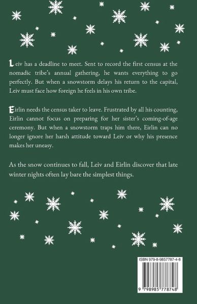 Leiv has a deadline to meet. Sent to record the first census at the nomadic tribe's annual gathering, he wants everything to go perfectly. But when a snowstorm delays his return to the capital, Leiv must face how foreign he feels in his own tribe. Eirlin needs the census taker to leave. Frustrated by all his counting, Eirlin cannot focus on preparing for her sister's coming-of-age ceremony. But when a snowstorm traps him there, Eirlin can no longer ignore her harsh attitude toward Leiv or why his presence makes her uneasy. As the snow continues to fall, Leiv and Eirlin discover that late winter nights often lay bare the simplest things.