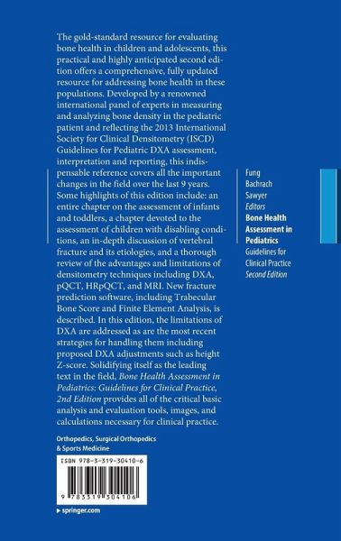 Chapter 1 - Rationale for Bone health Assessment in Childhood and Adolescence.- Chapter 2 - Tools for Measuring Bone in Children and Adolescents.- Chapter 3 - Dual-energy X-ray Absorptiomery Technology.- Chapter 4 - Indications for DXA in Children and Adolescents.- Chapter 5 - Acquisition of DXA in Children and Adolescents.- Chapter 6 - Analysis & Evaluation of DXA in Children and Adolescents.- Chapter 7 - Reporting DXA Results: Specifics for Children and Adolescents.- Chapter 8 - DXA Evaluation of Infants and Toddlers.- Chapter 9 - DXA in Children with Special Needs.- Chapter 10 - Bone Mineral Density as a Predictor of Vertebral Fractures in Children and Adolescents.- Chapter 11 - Lessons Learned from Clinical Research Using QCT, pQCT and HR-pQCT.- Chapter 12 - Evaluation of Fracture without Known Trauma: Use of DXA in Differential Diagnosis.- Chapter 13 - What's Next in the Field of Bone Health in Pediatrics? Research Considerations.- Appendix - Appendices: including Resources, intake & registration forms, Health questionnaires, and normative data.