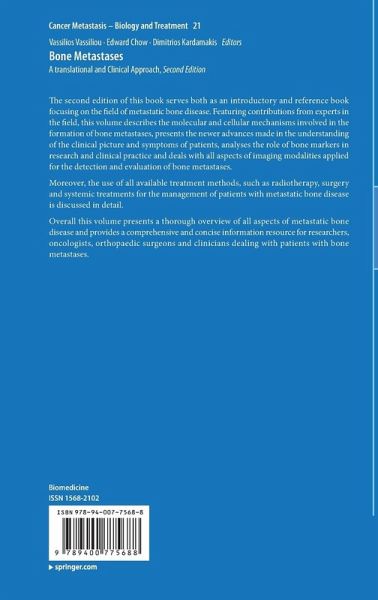 The second edition of this book serves both as an introductory and reference book focusing on the field of metastatic bone disease. Featuring contributions from experts in the field, this volume describes the molecular and cellular mechanisms involved in the formation of bone metastases, presents the newer advances made in the understanding of the clinical picture and symptoms of patients, analyses the role of bone markers in research and clinical practice and deals with all aspects of imaging modalities applied for the detection and evaluation of bone metastases. Moreover, the use of all available treatment methods, such as radiotherapy, surgery and systemic treatments for the management of patients with metastatic bone disease is discussed in detail. Overall this volume presents a thorough overview of all aspects of metastatic bone disease and provides a comprehensive and concise information resource for researchers, oncologists, orthopaedic surgeons and clinicians dealing withpatients with metastatic bone disease.