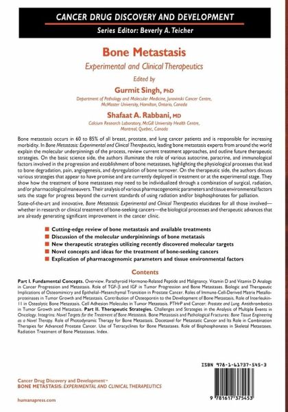A state-of-the-art review of the molecular underpinnings of bone-seeking cancers, current treatment approaches for them, and future therapeutic strategies. The authors illuminate the role of various autocrine, paracrine, and immunological factors involved in the progression and establishment of bone metastases, highlighting the physiological processes that lead to bone degradation, pain, angiogenesis, and dysregulation of bone turnover. They also discuss the various strategies that appear to have promise and are currently deployed in treatment or are at the experimental stage. Bone metastasis occurs in 60 to 85% of all breast, prostate, and lung cancer patients and is responsible for increasing morbidity. In Bone Metastasis: Experimental and Clinical Therapeutics, leading bone metastasis experts from around the world explain the molecular underpinnings of the process, review current treatment approaches, and outline future therapeutic strategies. On the basic science side, the authors illuminate the role of various autocrine, paracrine, and immunological factors involved in the progression and establishment of bone metastases, highlighting the physiological processes that lead to bone degradation, pain, angiogenesis, and dysregulation of bone turnover. On the therapeutic side, the authors discuss various strategies that appear to have promise and are currently deployed in treatment or at the experimental stage. They show how the treatment of bone metastases may need to be individualized through a combination of surgical, radiation, and/or pharmacological maneuvers. Their analysis of various pharmacogenomic parameters and tissue environmental factors sets the stage for progress beyond the current standards of using radiation and/or bisphosphonates for palliation.