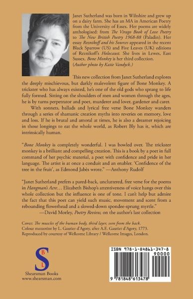 This disturbing new collection from Janet Sutherland explores the deeply mischievous, but darkly malevolent figure of Bone Monkey. A trickster who has always existed, he's one of the old gods who sprang to life fully formed. Sitting on the shoulders of men and women through the ages, he is by turns perpetrator and poet, murderer and lover, gardener and carer. With sonnets, ballads and lyrical free verse Bone Monkey wanders through a series of shamanic creation myths into reveries on memory, love and loss. If he is brutal and amoral at times, he is also a dreamer rejoicing in those 'longings to eat the whole world', as Robert Bly has it, which are intrinsically human.