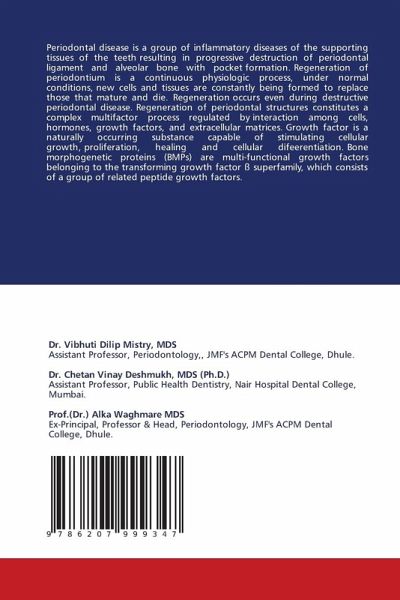 Periodontal disease is a group of inflammatory diseases of the supporting tissues of the teeth resulting in progressive destruction of periodontal ligament and alveolar bone with pocket formation. Regeneration of periodontium is a continuous physiologic process, under normal conditions, new cells and tissues are constantly being formed to replace those that mature and die. Regeneration occurs even during destructive periodontal disease. Regeneration of periodontal structures constitutes a complex multifactor process regulated by interaction among cells, hormones, growth factors, and extracellular matrices. Growth factor is a naturally occurring substance capable of stimulating cellular growth, proliferation, healing and cellular difeerentiation. Bone morphogenetic proteins (BMPs) are multi-functional growth factors belonging to the transforming growth factor ß superfamily, which consists of a group of related peptide growth factors.