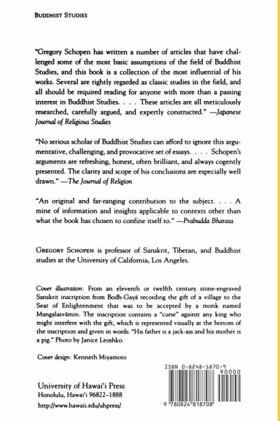From the Preface "The present volume provides an essential foundation for a social history of Indian Buddhist monasticism. Challenging the popular stereotype that represented the accumulation of merit as the domain of the layperson while monks concerned themselves with more sophisticated realms of doctrine and meditation, Professor Schopen problematizes many assumptions about the lay-monastic distinction by demonstrating that monks and nuns, both the scholastic elites and the less learned, participated actively in a wide range of ritual practices and institutions that have heretofore been judged 'popular,' from the accumulation and transfer of merit; to the care of deceased relatives;.... Taken together, the studies contained in this volume represent the basis for a new historiography of Buddhism, not only for their critique of many of the idees recues of Buddhist Studies but for the compelling connections they draw between apparently disparate details." —Donald S. Lopez, Jr.