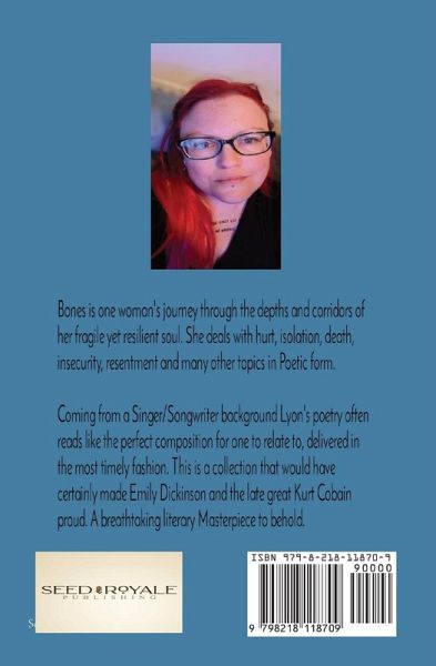 Bones is one woman's journey through the depths and corridors of her fragile yet resilient soul. She deals with hurt, isolation, death, insecurity, resentment and many other topics in Poetic form. Coming from a Singer/Songwriter background Lyon's poetry often reads like the perfect composition for one to relate to, delivered in the most timely fashion. This is a collection that would have certainly made Emily Dickinson and the late great Kurt Cobain proud. A breathtaking literary Masterpiece to behold.
