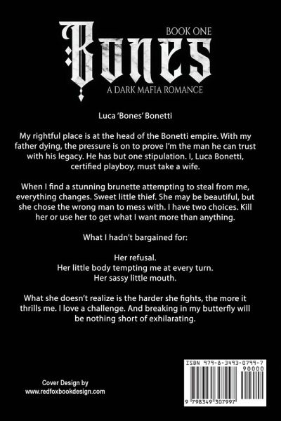 Luca 'Bones' Bonetti My rightful place is at the head of the Bonetti empire. With my father dying, the pressure is on to prove I'm the man he can trust with his legacy. He has but one stipulation. I, Luca Bonetti, certified playboy, must take a wife. When I find a stunning brunette attempting to steal from me, everything changes. Sweet little thief. She may be beautiful, but she chose the wrong man to mess with. I have two choices. Kill her or use her to get what I want more than anything. What I hadn't bargained for: Her refusal. Her little body tempting me at every turn. Her sassy little mouth. What she doesn't realize is the harder she fights, the more it thrills me. I love a challenge. And breaking in my butterfly will be nothing short of exhilarating.