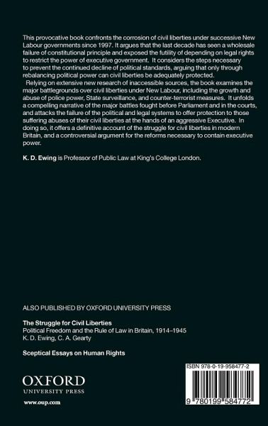 This provocative book confronts the corrosion of civil liberties under successive New Labour governments since 1997. It argues that the last decade has seen a wholesale failure of constitutional principle and exposed the futility of depending on legal rights to restrict the power of executive government. It considers the steps necessary to prevent the continued decline of political standards, arguing that only through rebalancing political power can civil liberties be adequately protected. Relying on extensive new research of inaccessible sources, the book examines the major battlegrounds over civil liberties under New Labour, including the growth and abuse of police power, state surveillance and counter-terrorist measures. It unfolds a compelling narrative of the major battles fought before Parliament and in the courts, and attacks the failure of the political and legal systems to offer protection to those suffering abuses of their civil liberty at the hands of an aggressive Executive. In doing so, it offers a definitive account of the struggle for civil liberty in modern Britain, and a controversial argument for the reforms necessary to contain executive power.