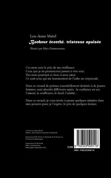 Ces mots sont le prix de ma résilience.Ceux que je ne prononcerais jamais à vive voix.Des mots pourtant si chers à mon coeur.Ce sont ceux qui me tourmentent de l'aube au crépuscule.Dans ce recueil de poème essentiellement destinés à de jeunes femmes, sont abordés différents sujets: la confiance en soi, l'amour, la souffrance, le deuil, l'amitié... Dans ce recueil, je vous invite à passer quelques minutes dans mes pensées pour, je l'espère, le prix de quelques larmes...