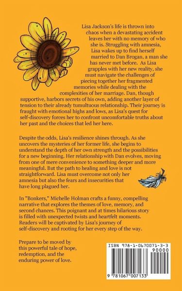 Lisa Jackson's life is thrown into chaos when a devastating accident leaves her with no memory of who she is. Struggling with amnesia, Lisa wakes up to find herself married to Dan Brogan, a man she has never met before. As Lisa grapples with her new reality, she must navigate the challenges of piecing together her fragmented memories while dealing with the complexities of her marriage. Dan, though supportive, harbors secrets of his own, adding another layer of tension to their already tumultuous relationship. Their journey is fraught with emotional highs and lows, as Lisa's quest for self-discovery forces her to confront uncomfortable truths about her past and the choices that led her here. Despite the odds, Lisa's resilience shines through. As she uncovers the mysteries of her former life, she begins to understand the depth of her own strength and the possibilities for a new beginning. Her relationship with Dan evolves, moving from one of mere convenience to something deeper and more meaningful. But the path to healing and love is not straightforward. Lisa must overcome not only her apparent amnesia and how this effects those closest to her, but also the fears and insecurities that have long plagued her. In "Bonkers," Michelle Holman crafts a funny, compelling narrative that explores the themes of love, memory, and second chances. This poignant and at times hilarious story is filled with unexpected twists and heartfelt moments. Readers will be captivated by Lisa's journey of self-discovery and rooting for her every step of the way. Prepare to be moved by this powerful tale of hope, redemption, and the enduring power of love.