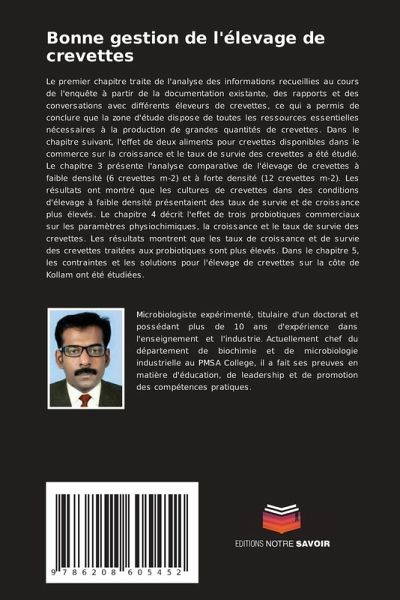 Le premier chapitre traite de l'analyse des informations recueillies au cours de l'enquête à partir de la documentation existante, des rapports et des conversations avec différents éleveurs de crevettes, ce qui a permis de conclure que la zone d'étude dispose de toutes les ressources essentielles nécessaires à la production de grandes quantités de crevettes. Dans le chapitre suivant, l'effet de deux aliments pour crevettes disponibles dans le commerce sur la croissance et le taux de survie des crevettes a été étudié. Le chapitre 3 présente l'analyse comparative de l'élevage de crevettes à faible densité (6 crevettes m-2) et à forte densité (12 crevettes m-2). Les résultats ont montré que les cultures de crevettes dans des conditions d'élevage à faible densité présentaient des taux de survie et de croissance plus élevés. Le chapitre 4 décrit l'effet de trois probiotiques commerciaux sur les paramètres physiochimiques, la croissance et le taux de survie des crevettes. Les résultats montrent que les taux de croissance et de survie des crevettes traitées aux probiotiques sont plus élevés. Dans le chapitre 5, les contraintes et les solutions pour l'élevage de crevettes sur la côte de Kollam ont été étudiées.