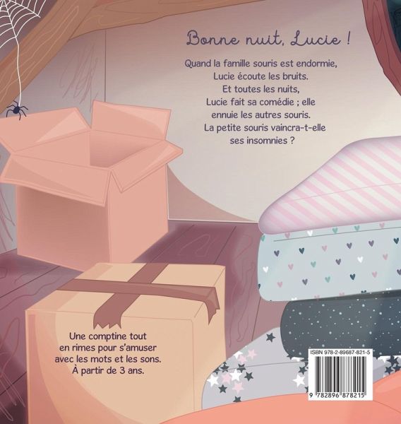 " Bonne nuit, Lucie !" Quand la famille souris est endormie, Lucie écoute les bruits. Et toutes les nuits,Lucie fait sa comédie ; elle ennuie les autres souris. La petite souris vaincra-t-elle ses insomnies ? Une comptine tout en rimes pour s'amuser avec les mots et les sons. À partir de 3 ans. Ce livre est également disponible avec une couverture souple (ISBN : 9782896876327). " Qui a mangé mon croûton ? " et " Saperlipopette ! Où sont mes chaussettes ? " Les 2 albums de cette collection sont également disponibles.