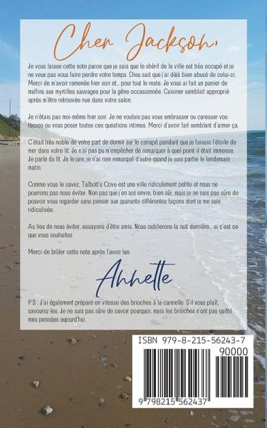 Cher Jackson, Je vous laisse cette note parce que je sais que le shérif de la ville est très occupé et je ne veux pas vous faire perdre votre temps. Dieu sait que j'ai déjà bien abusé de celui-ci. Merci de m'avoir ramenée hier soir et… pour tout le reste. Je vous ai fait un panier de muffins aux myrtilles sauvages pour la gêne occasionnée. Cuisiner semblait approprié après m'être retrouvée nue dans votre salon. Je n'étais pas moi-même hier soir. Je ne voulais pas vous embrasser ou caresser vos fesses ou vous poser toutes ces questions intimes. Merci d'avoir fait semblant d'aimer ça. C'était très noble de votre part de dormir sur le canapé pendant que je faisais l'étoile de mer dans votre lit. Je n'ai pas pu m'empêcher de remarquer à quel point il était immense. Je parle du lit. Je le jure, je n'ai rien remarqué d'autre quand je suis partie le lendemain matin. Comme vous le savez, Talbott's Cove est une ville ridiculement petite et nous ne pourrons pas nous éviter. Non pas que j'en aie envie, bien sûr, mais je ne suis pas sûre de pouvoir vous regarder sans penser aux quarante différentes façons dont je me suis ridiculisée. Au lieu de nous éviter, essayons d'être amis. Nous oublierons la nuit dernière… si c'est ce que vous souhaitez. Merci de brûler cette note après l'avoir lue. Annette P.S : J'ai également préparé en vitesse des brioches à la cannelle. S'il vous plaît, savourez-les. Je ne suis pas sûre de savoir pourquoi, mais les brioches n'ont pas quitté mes pensées aujourd'hui.