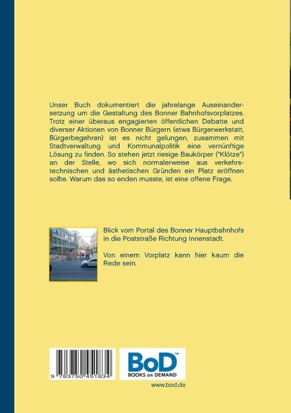 Dieses Buch dokumentiert die jahrelange Auseinandersetzung über die Gestaltung des Vorplatzes am Bonner Hauptbahnhof. Trotz einer regen und engagierten öffentlichen Debatte und diversen Aktionen der Bonner Bürger ist es nicht gelungen, eine vernünftige Lösung zu finden. So stehen jetzt riesige Baukörper ("Klötze") an der Stelle, wo normalerweise aus verkehrstechnischen und ästhetischen Gründen ein Platz sein sollte. Warum das so enden musste, ist eine offene Frage.