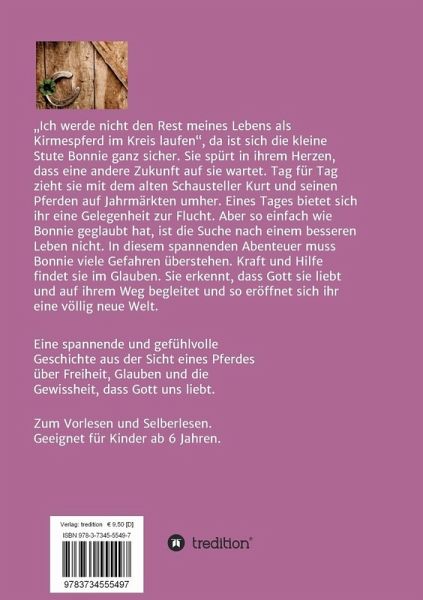 "Ich werde nicht den Rest meines Lebens als Kirmespferd im Kreis laufen", da ist sich die kleine Stute Bonnie ganz sicher. Sie spürt in ihrem Herzen, dass eine andere Zukunft auf sie wartet. Tag für Tag zieht sie mit dem alten Schausteller Kurt und seinen Pferden auf Jahrmärkten umher. Eines Tages bietet sich ihr eine Gelegenheit zur Flucht. Aber so einfach wie Bonnie geglaubt hat, ist die Suche nach einem besseren Leben nicht. Einsam wandert sie durch Regen und Herbststürme auf der Suche nach dem Fohlen, von dem sie nachts immer wieder träumt. Ist dieses Fohlen der Schlüssel zu ihrer Zukunft? Wird der alte, jähzornige Kurt sie finden? In diesem spannenden Abenteuer muss Bonnie viele Gefahren überstehen. Kraft und Hilfe findet sie im Glauben. Sie erkennt, dass Gott sie liebt und auf ihrem Weg begleitet und so eröffnet sich ihr eine völlig neue Welt. Bonnie findet ihr Glück.