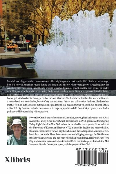 Bonnie's story begins at the commencement of her eighth-grade school year in 1961. But in so many ways, hers is a story of American youths during any time in our history, when young people struggle against the cruelty of their own peers, the difficulty of rapid sexual and physical growth and the even greater difficulty of holding onto ideals, while surmounting the hypocrisy of their elders. Bonnie is uprooted from her Bronx home at thirteen, taken from her violin instructor and from a city with enormous cultural advantages for any boy or girl with bus fare to Carnegie Hall or the Met Museum. She finds herself isolated in a new split-level, a new school, and new clothes, bereft of any connection to the art and culture that she loves. She loses her mother from an auto accident, but makes one good friend in a budding writer who with her beloved father, a disabled city fireman, helps her overcome a teenage rape, raise a child from that pregnancy, and find a path toward life-sustaining self-expression.