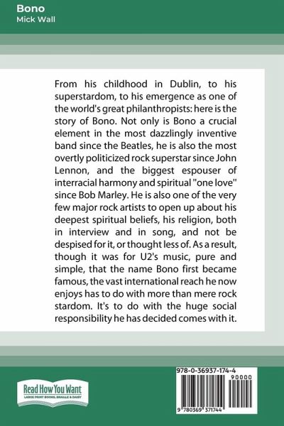 From his childhood in Dublin, to his superstardom, to his emergence as one of the world's great philanthropists: here is the story of Bono. Not only is Bono a crucial element in the most dazzlingly inventive band since the Beatles, he is also the most overtly politicized rock superstar since John Lennon, and the biggest espouser of interracial harmony and spiritual ''one love'' since Bob Marley. He is also one of the very few major rock artists to open up about his deepest spiritual beliefs, his religion, both in interview and in song, and not be despised for it, or thought less of. As a result, though it was for U2's music, pure and simple, that the name Bono first became famous, the vast international reach he now enjoys has to do with more than mere rock stardom. It's to do with the huge social responsibility he has decided comes with it. With a long history of campaigning behind him - from the movingly rousing ''Sunday Bloody Sunday'' to the moment he phoned Bill Clinton live on - stage as images of war - ravaged Sarajevo flashed across giant screens behind him - politics and rock 'n' roll have always been linked in Bono's mind.