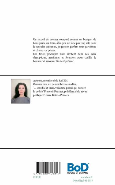 Un recueil de poèmes composé comme un bouquet de bons jours sur terre, afin qu'il ne fane pas trop vite dans le vase des souvenirs, et que son parfum vous parvienne et chasse vos peines.Ces fleurs poétiques possèdent différentes couleurs, différentes formes et vous invitent dans des lieux champêtres, maritimes et forestiers.Dans la nature, le bonheur nous fait des clins d'oeil, à nous de savoir le cueillir, le respirer et le vivre dans l'instant présent.