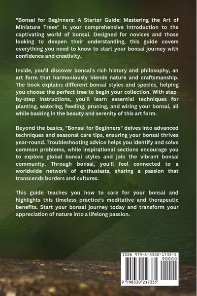 "Bonsai for Beginners: A Starter Guide- Mastering the Art of Miniature Trees" is your comprehensive introduction to the captivating world of bonsai. Designed for novices and those looking to deepen their understanding, this guide covers everything you need to know to start your bonsai journey with confidence and creativity. Inside, you'll discover bonsai's rich history and philosophy, an art form that harmoniously blends nature and craftsmanship. The book explains different bonsai styles and species, helping you choose the perfect tree to begin your collection. With step-by-step instructions, you'll learn essential techniques for planting, watering, feeding, pruning, and wiring your bonsai, all while basking in the beauty and serenity of this art form. Beyond the basics, "Bonsai for Beginners" delves into advanced techniques and seasonal care tips, ensuring your bonsai thrives year-round. Troubleshooting advice helps you identify and solve common problems, while inspirational sections encourage you to explore global bonsai styles and join the vibrant bonsai community. Through bonsai, you'll feel connected to a worldwide network of enthusiasts, sharing a passion that transcends borders and cultures. This guide teaches you how to care for your bonsai and highlights this timeless practice's meditative and therapeutic benefits. Start your bonsai journey today and transform your appreciation of nature into a lifelong passion.