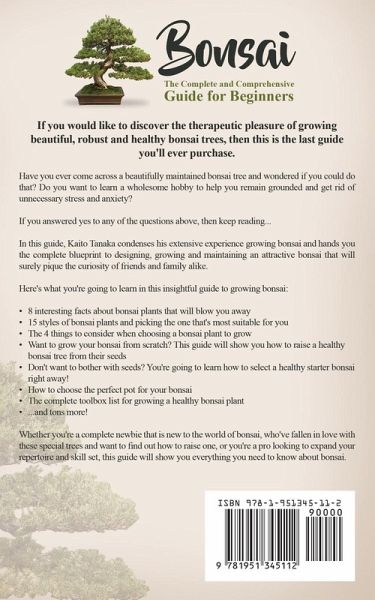 If you would like to discover the therapeutic pleasure of growing beautiful, robust and healthy bonsai trees, then this guide is for you Have you ever come across a beautifully maintained bonsai tree and wondered if you could do that? Do you want to learn a wholesome hobby to help you remain grounded and get rid of unnecessary stress and anxiety? If you answered yes to any of the questions above, then keep reading... In this guide, Kaito Tanaka condenses his extensive experience growing bonsai and hands you the complete blueprint to designing, growing and maintaining an attractive bonsai that will surely pique the curiosity of friends and family alike. Here's what you're going to learn in this insightful guide to growing bonsai: * 8 interesting facts about bonsai plants that will blow you away * 15 styles of bonsai plants and picking the one that's most suitable for you * The 4 things to consider when choosing a bonsai plant to grow * Want to grow your bonsai from scratch? This guide will show you how to raise a healthy bonsai tree from their seeds * Don't want to bother with seeds? You're going to learn how to select a healthy starter bonsai right away! * How to choose the perfect pot for your bonsai * The complete toolbox list for growing a healthy bonsai plant * ...and tons more! Whether you're completely new to the world of bonsai, who've fallen in love with these special trees and want to find out how to raise one, or you're a pro looking to expand your repertoire and skillset, this guide will show you everything you need to know about bonsai. Scroll up and click the "add to cart" button to buy now!