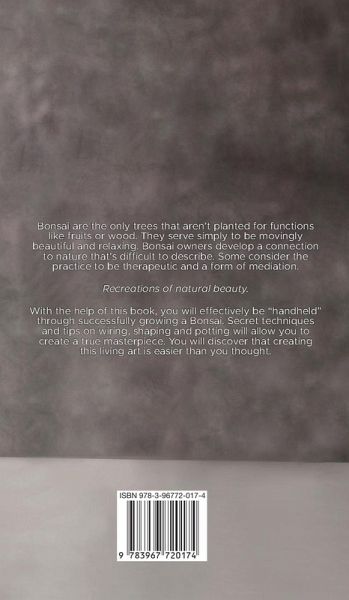 Do you want to learn more about the art of Bonsai and create your own masterpiece without wasting a lot of time and money? Then keep reading... Bonsai are the only trees that aren't planted for functions like fruits or wood. They serve simply to be movingly beautiful and relaxing. Bonsai owners develop a connection to nature that's difficult to describe. Some consider the practice to be therapeutic and a form of mediation. Recreations of natural beauty. It is quite a difficult hobby to master, however. Over pruning and creating an unbalanced tree is common for beginners. This can make your tree look unnatural and unhealthy. Changes take a long time to see and patience is necessary... But what if you are making mistakes and doing all of that waiting for nothing? This is where our guide book can help. You will effectively be "handheld" through successfully growing a Bonsai. Secret techniques and tips on wiring, shaping, and potting will allow you to create a true masterpiece. You will discover that creating this living art is easier than you thought. Here's just a little of what you will find inside...History of the art and the important role Buddhist Monks played in developing it. The basic styles you must know to help create your own inspiration. The 7 tools you need for the art. How to wire your tree without damaging branches or the trunk. A secret trick all masters use to keep their plants looking amazing year-round. The simple, but incredibly effective way to repot your tree. What you must know BEFORE displaying your Bonsai (inside or outside). ... and much, much more. This is a great book for beginners, but even for specialists, there will be tips that help keep your work looking healthy and balanced. Ready to grow and display your own Bonsai? It's as easy as scrolling up and tapping "Buy Now".