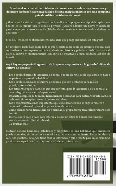 Domine el arte de cultivar árboles de bonsái sanos, robustos y hermosos y descubra los beneficios terapéuticos de esta antigua práctica con una completa guía de cultivo de árboles de bonsái. ¿Alguna vez ha visto un magnífico árbol bonsái y se ha preguntado si podría replicar esa belleza en su propia casa y espacio privado? ¿Quiere adoptar un nuevo y saludable pasatiempo que desarrolle sus habilidades de jardinería mientras le ayuda a deshacerse del estrés? Si es así, ¡entonces es absolutamente necesario que ponga sus manos en esta guía! En este libro, Daiki Sato cubre todo lo que necesita saber sobre los árboles de bonsái para convertirse en un experto en bonsái, desde su historia y prácticas modernas hasta el diseño, cultivo y mantenimiento con éxito de atractivos y bien cuidados árboles de bonsái. Aquí hay un pequeño fragmento de lo que va a aprender en la guía definitiva de cultivo de bonsáis: * Los 5 estilos básicos de jardinería de bonsái y cómo elegir el estilo que desee en base a su preferencia y nivel de habilidad * The 3 essential bonsai growing styles that are perfect for beginners to get started with * Los diferentes tipos de árboles que son perfectos para la jardinería de los bonsáis, y cómo elegir el más adecuado para usted * Una lista completa de todas las herramientas necesarias para cultivar robustos árboles de bonsái sin complicaciones ni dolores de cabeza. * Las 3 características más importantes que considerar cuando se elige la maceta o contenedor adecuado para albergar su árbol de bonsái * Cómo seleccionar la tierra correcta y mezclar su propia tierra para cultivar su árbol de bonsái * Instrucciones paso a paso para cablear y doblar un árbol de bonsái con consejos esenciales para facilitar el cableado