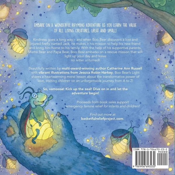 Embark On a Wonderful Rhyming Adventure As You Learn the Value of all Living Creatures, Great and Small! Kindness goes a long way - and when Boo Bear discovers a lost and injured firefly named Jack, he makes it his mission to help his new friend and bring him home to his family. With the help of his supportive parents Mama Bear and Papa Bear, Boo Bear embarks on a rescue mission that will light up your day and leave no letter unturned! Beautifully written by multi-award-winning author, Catherine Ann Russell, with vibrant illustrations by Jessica Robin Harkey, Boo Bear's Light shares a heartwarming moral lesson about the transformative power of love, inviting children on an unforgettable journey from A to Z! Inside the book, you'll discover: A Beautiful Rhyming Story that Makes Learning the Alphabet Educational and Entertaining A Memorable Way to Learn New Rhythms and Words and Expand Your Little One's Vocabulary Colorful Illustrations that Ignite Curiosity, Wonder and Spark Your Child's Imagination as They Hunt for a Hidden Letter in Each Panel Vital Moral Lessons about the Miracle of Love, Kindness, & Helping Those In Need A Wonderful Bedtime Story, Classroom Resource, and Teaching Tool For Boys & Girls Ages 0-7 And So Much More... Ideal for parents & educators who want to raise compassionate children while teaching them essential early learning skills, Boo Bear's Light will quickly become a treasured part of your bookshelf. So, vamoose! Kick up the zeal! Dive on in and let the adventure begin! Proceeds from book sales support emergency famine relief for infants and children. Find out more at www.basketfulreliefproject.com. Explore all of Catherine's Children's Picture Books in The Little Library of Treasures Series: Get to Bed! The Little Book of Why Picco and Wren Three Boo Bear's Light: An ABC Rhyming Picture Book for Children