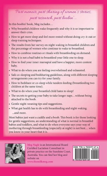Part memoir, part sharing of women’s stories, part research, part boobin’. In this boobin’ book, Meg includes, • Why breastfed children wake frequently and why it is so important to answer their cries. • How to get more sleep and feel more rested without doing cry-it-out or sleep training techniques. • The results from her survey on night-waking in breastfed children and the percentage of women who continue to wake to breastfeed. • How to combine routines or rituals with breastfeeding on demand. • Why it is not a bad habit to breastfeed your little one to sleep. • How to find your inner marsupial and have a happier, more content baby. • What to do when you are feeling overwhelmed and exhausted. • Safe co-sleeping and bedsharing guidelines, along with different sleeping arrangements you can try for your family. • How to bedshare or co-sleep while tandem feeding (breastfeeding two children at the same time). • What to do when your breastfed child hates to sleep! • The secrets to getting your baby to take longer naps…without being attached to the boob. • Gentle night-weaning tips and suggestions. • What gut health has to do with breastfeeding and night-waking.Most babies just want a cuddle and a boob. This book is for those looking for gentle suggestions, an understanding of what is normal in breastfed babies and toddlers, and what to do when everyone says your way of mothering through breastfeeding especially at night) is not best… when you know in your heart that it is.