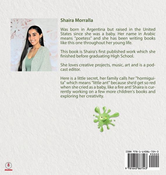 Shaira Morralla Was born in Argentina but raised in the United States since she was a baby. Her name in Arabic means "poetess" and she has been writing books like this one throughout her young life. This book is Shaira's first published work which she finished before graduating High School. She loves creative projects, music, art and is a podcast editor. Here is a little secret, her family calls her "hormiguita" which means "little ant" because she'd get so red when she cried as a baby, like a fire ant! Shaira is currently working on a few more children's books and exploring her creativity.
