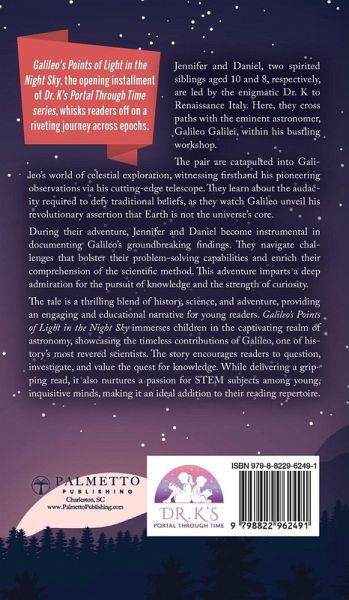 Join Jennifer and Daniel in a thrilling journey back to 1631, where they meet Galileo, witness his astronomical discoveries, test their problem-solving skills, and explore the cosmos. In the awarding-winning Galileo's Points of Light in the Night Sky, the first book of the captivating Dr. K's Portal Through Time series, Jennifer, a vivacious 10-year-old, and her intellectually curious 8-year-old brother, Daniel, embark on an exceptional voyage through the annals of time. Guided by the enigmatic and brilliant scientist, Dr. K, they are transported to the heyday of Renaissance Italy, straight into the workshop of the iconic astronomer, Galileo Galilei. As they traverse the time portal, Jennifer and Daniel experience firsthand Galileo's groundbreaking observations of the celestial expanse through his innovative telescope. They are enlightened about the significance of questioning established norms and the audacity needed to defy the status quo. The siblings witness Galileo's unveiling of the cosmos's wonders and his revolutionary proposition that our Earth is not the center of the universe. Throughout their journey, Jennifer and Daniel support Galileo in chronicling his pioneering discoveries. They confront challenges that enhance their problem-solving abilities and deepen their grasp of the scientific method. Their adventure cultivates an appreciation for the quest for knowledge and the potency of curiosity. This enthralling tale seamlessly blends history, science, and adventure. It offers young readers a captivating, educational narrative, introducing them to the mesmerizing world of astronomy and the enduring contributions of one of history's most illustrious scientists. The story of Jennifer and Daniel will inspire the readers to question, explore, and cherish the pursuit of knowledge, just like Galileo did. The book, while being a thrilling read, also helps foster a love for STEM disciplines in young, inquisitive minds, making it a perfect addition to any child's reading list. At the end of Book 1 is a QR code for the Science Primer, a comprehensive, free downloadable guide over 100 pages long, written specifically for parents and teachers. It also includes a complete Teacher's Guide with detailed lesson plans, a glossary of terms, and an extensive list of resources such as books, videos, websites, and other online Resources for teaching about Galileo and his discoveries. The primer is designed to make science education engaging and accessible. Each of the books written for the series will feature its own tailored Science Primer. Book 1 itself also includes a glossary of terms and resources designed specifically for children ages 8-12, complementing the exciting adventures of Jennifer and Daniel.
