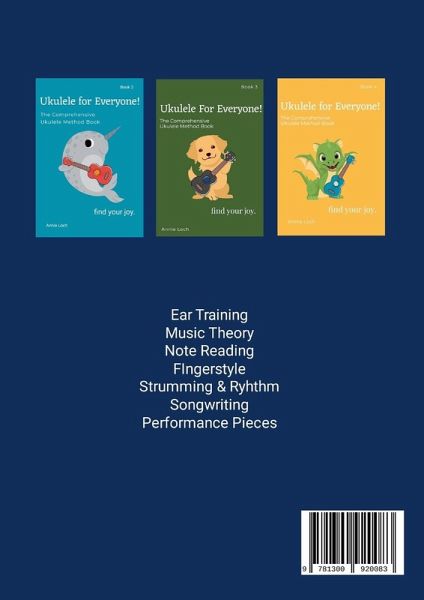 Ukulele for Everyone! The Comprehensive Ukulele Method Book One is a comprehensive music program that teaches music theory, songwriting skills, fingerstyle as well as strumming skills. Students will learn how to read the full C scale and over 40 songs to play, including some they write themselves! You will stay engaged through games, activities and exercises as you learn how to play the world's most joyful instrument - the ukulele!