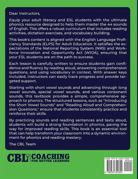 BOOK 2: Phonics and Life Skills Reading for Adult Literacy, ABE, and ESL Students Equip your adult literacy, ABE, and ESL students with the ultimate phonics resource designed to help them master the 44 sounds of English. This offers a robust curriculum that includes reading activities, dictation exercises, and vocabulary building. This book's content is aligned with the English Language Proficiency Standards (ELPS) for Adult Education. It satisfies the expectations of the National Reporting System (NRS) and Workforce Innovation and Opportunity Act (WIOA), ensuring that your ESL students are on the path to success. Each lesson is carefully written to ensure students gain confidence and fluency by reading aloud, answering comprehension questions, and using vocabulary in context. With answer keys included, instructors can easily track progress and provide targeted support. Starting with short vowel sounds and advancing through long vowel sounds, special vowel sounds, and various consonant sounds, this textbook provides a simple, comprehensive approach to phonics. The structured lessons, such as "Introducing the Short Vowel Sounds" and "Reading Aloud and Comprehension Questions," ensure that students consistently practice and reinforce their skills. By practicing sounds and reading sentences and texts aloud, students will build a strong foundation in phonics, paving the way for improved reading skills. This book is an essential tool that can help transform your classroom into a dynamic environment for phonics and reading mastery.
