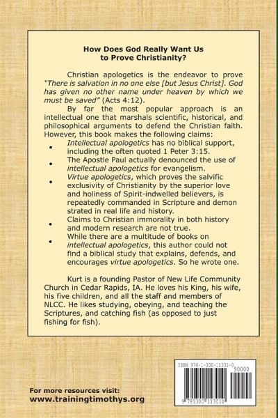 How Does God Really Want Us to Prove Christianity Christian apologetics is the endeavor to prove "There is salvation in no one else [but Jesus Christ]." The popular intellectual approach marshals scientific, historical, and philosophical arguments to defend the Christian faith. However, this book makes the following claims: ¿ Intellectual apologetics has no biblical support, including the often quoted 1 Peter 3:15. ¿ The Apostle Paul actually denounced the use of intellectual apologetics for evangelism. ¿ Virtue apologetics, which proves the salvific exclusivity of Christianity by the superior love and holiness of Spirit-indwelled believers, is repeatedly commanded in Scripture and demonstrated in real life and history. ¿ Claims to Christian immorality in both history and modern research are not true. ¿ While there are a multitude of books on intellectual apologetics, this author could not find a biblical study that explains, defends, and encourages virtue apologetics. So he wrote one.