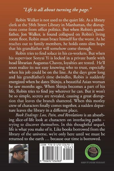 "Life is all about turning the page." Robin Walker is not used to the quiet life. As a library clerk at the 58th Street Library in Manhattan, the disruptions come from office politics. But when Robin's grandfather, Jon Walker, is found collapsed on Robin's living room floor, Robin must brace himself for the worst. As he reaches out to family members, he holds onto slim hope that his grandfather will somehow come through. Robin tries to find solace in his co-workers. But when his supervisor Sonyai Yi is locked in a private battle with head librarian Augustus Chavez, loyalties are tested. He'll soon realize its not easy knowing who to trust, especially when his job could be on the line. As the days grow long and his grandfather's time dwindles, Robin is suddenly energized when he dates Shinju, a beautiful Asian woman he saw months ago. When Shinju becomes a part of his life, Robin tries to find joy wherever he can. But it won't be so simple, secrets are revealed, causing a great disruption that leaves the branch shattered. When this motley crew of characters finally comes together, a sudden departure leaves the library in a different place. Book Endings: Loss, Pain, and Revelations is an absorbing slice-of-life look at characters on interlacing paths - trying to discover themselves. In this thoughtful sequel, life is what you make of it. Like books borrowed from the library of the universe, we're only here until we must be returned to the earth... because our time is borrowed.