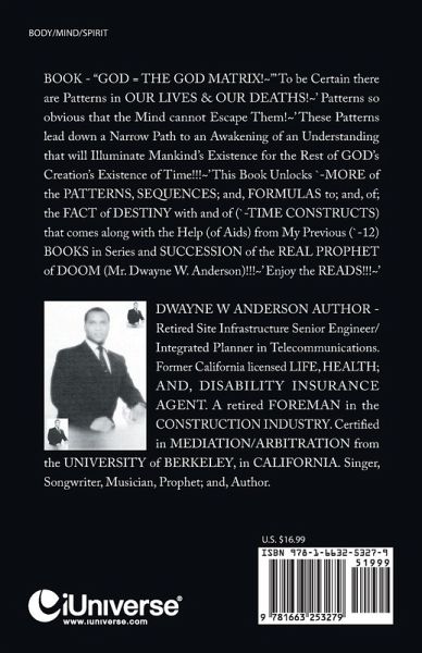 BOOK - "GOD = THE GOD MATRIX!~'" To be Certain there are Patterns in OUR LIVES & OUR DEATHS!~' Patterns so obvious that the Mind cannot Escape Them!~' These Patterns lead down a Narrow Path to an Awakening of an Understanding that will Illuminate Mankind's Existence for the Rest of GOD's Creation's Existence of Time!!!~' This Book Unlocks `-MORE of the PATTERNS, SEQUENCES; and, FORMULAS to; and, of; the FACT of DESTINY with and of (`-TIME CONSTRUCTS) that comes along with the Help (of Aids) from My Previous (`-12) BOOKS in Series and SUCCESSION of the REAL PROPHET of DOOM (Mr. Dwayne W. Anderson)!!!~' Enjoy the READS!!!~'