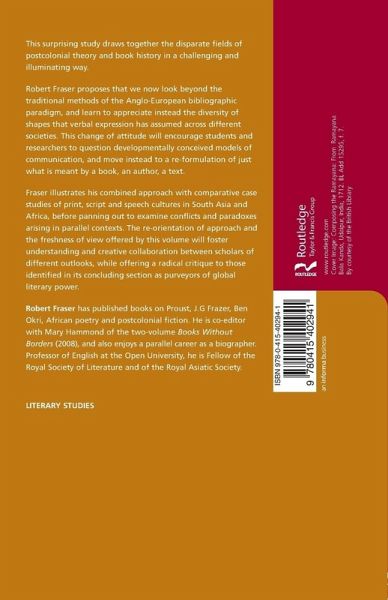 This surprising study draws together the disparate fields of postcolonial theory and book history in a challenging and illuminating way. Robert Fraser proposes that we now look beyond the traditional methods of the Anglo-European bibliographic paradigm, and learn to appreciate instead the diversity of shapes that verbal expression has assumed across different societies. This change of attitude will encourage students and researchers to question developmentally conceived models of communication, and move instead to a re-formulation of just what is meant by a book, an author, a text. Fraser illustrates his combined approach with comparative case studies of print, script and speech cultures in South Asia and Africa, before panning out to examine conflicts and paradoxes arising in parallel contexts. The re-orientation of approach and the freshness of view offered by this volume will foster understanding and creative collaboration between scholars of different outlooks, while offering a radical critique to those identified in its concluding section as purveyors of global literary power.