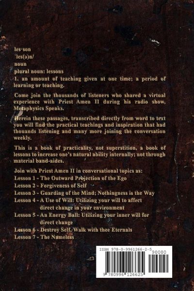 les·son ¿les(¿)n/ noun plural noun: lessons 1. an amount of teaching given at one time; a period of learning or teaching. Come join the thousands of listeners who shared a virtual experience with Priest Amen II during his radio show, Metaphysics Speaks. Herein these passages, transcribed directly from word to text you will find the practical teachings and inspiration that had thousands listening and many more joining the conversation weekly. This is a book of practicality, not superstition, a book of lessons to increase one's natural ability internally; not through material band-aides.