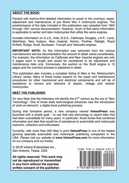 Packed with hard-to-find detailed information to assist in the overhaul, repair, adjustment and maintenance of pre World War II motorcycle engines. The predominance of the data in this publication was compiled from 1924 - 1931 service documentation. However some info is applicable to earlier and later motorcycles that use the same engines.