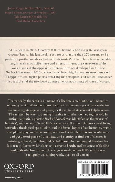 At his death in 2016, Geoffrey Hill left behind The Book of Baruch by the Gnostic Justin, a sequence of more than 270 poems, to be published posthumously as his final statement. It is a great work, and in Hill's oeuvre it is a uniquely welcoming work, open to all comers.
