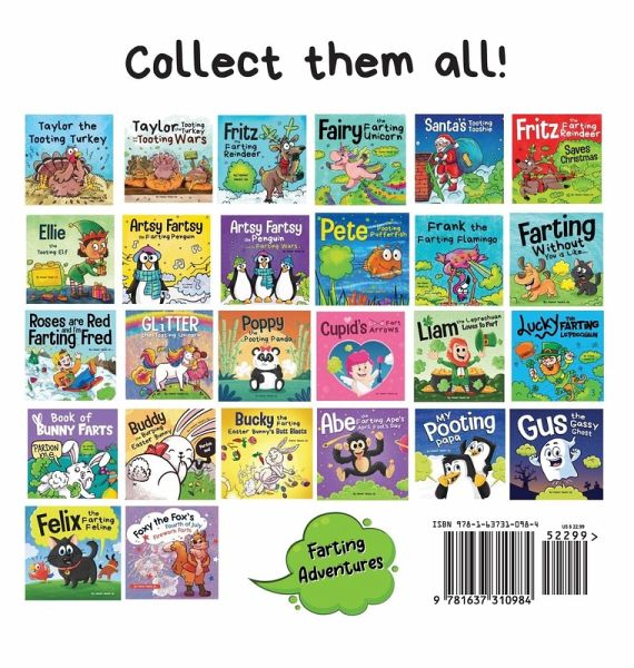 Have you ever wondered how the Easter Bunny manages to deliver all of those eggs? Well, he eats. A lot. Eating gives him energy, but it also means he farts a lot, too. In this hilarious book, the Easter Bunny explains all the different kinds of Easter farts bunnies release. Adults are permitted to laugh too. The funny book series, Farting Adventures, celebrates the value of laughter. The Farting Adventures book series is geared to kids and adults ages 0-100. Check out all the Farting adventures books: Taylor the Tooting Turkey Frank the Farting Flamingo Artsy Fartsy the Farting Penguin Fairy the Farting Unicorn Farting Without You is Like Roses are Red, And I'm Farting Fred Lucky the Farting Leprechaun Cupid's Love Arrows Pete the Pooting Pufferfish and Fritz the Farting Reindeer Perfect Easter or all yer round gift for your loved one!
