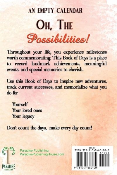 Throughout your life, you experience milestones worth commemorating. This Book of Days is a place to record landmark achievements, meaningful events, and special memories to Cherish. Use this Book of Days to inspire new adventures, track current successes, and memorialize what you do for Yourself Your loved ones Your Legacy Don't count the days, make every day count!