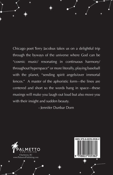 Chicago poet Terry Jacobus takes us on a delightful trip through the byways of the universe where God can be "cosmic music/ resonating in continuous harmony/ throughout hyperspace" or more literally, playing baseball with the planet, "sending spirit angels/over immortal fences." A master of the aphoristic form-the lines are centered and short so the words hang in space-these musings will make you laugh out loud but also move you with their insight and sudden beauty. - Jennifer Dunbar Dorn In Book of God, Chicago poet Terry Jacobus presents a collection of poetry for the ages. Featuring a wide spectrum of ideas and insights on the existence and presence of God, Jacobus explores spirituality in a way that feels accessible and entertaining. At times serious, and at times whimsical, his poems take on a life of their own as readers are left to contemplate their own connection to a higher power.