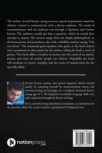 The author, Arvind Kumar owing to severe speech impairment caused by Autism, wanted to communicate with a diverse audience. The mode of communication with his audience was through a Question and Answer format. The audience would put him a question, which he would then attempt to answer. His answers range from the deeply philosophical, to the humourous, and sometimes, also with a childlike candour saying "I do not know". The renowned guest speakers who spoke at the book launch were unanimous in their praise for the author, calling his book a work of genius. This book offers a window to society into the mind of an autistic person, and what all autistic people can achieve. Hopefully, the book will inculcate in society empathy and the sense of inclusiveness for the specially-abled.