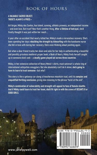 A VALUABLE SACRED OBJECT.THERE'S ALWAYS A PRICE-Art forger, Mikky dos Santos, has talent, cunning, athletic prowess, an independent income - and even love. But trust? Now that's another thing. After a lifetime of betrayal, she'd finally thought it was just within her reach ... A year after an accident that nearly killed her, Mikky's made a miraculous recovery. She's been spending her days rebuilding the strength by kitesurfing with the handsome nurse she fell in love with during her recovery. She's even thinking about painting again.But when a dear friend tracks her down and asks for her help in authenticating a beautiful and possibly priceless medieval prayer book, a Book of Hours, Mikky finds herself caught up in someone else's web - a deadly game played out across three countries.Mikky, in her extensive collection of Heavy Metal t-shirts, must outsmart a whole ring of international antiquities smugglers. But she absolutely can't do it alone; she's going to have to learn to trust someone-but who?This story is like a getaway car along a treacherous mountain road, until its complex and unqualified thrilling conclusion, giving new meaning to the phrase "twist at the end".Mikky's combination of vulnerability and strength will appeal to fans of female sleuths. And if Mikky could learn to trust her team, she'd fit right in with the crews of OCEAN'S 8 or GOOD GIRLS.