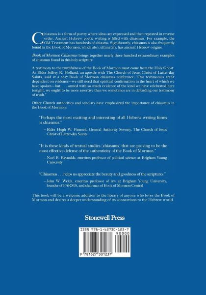 Chiasmus is a form of poetry where ideas are expressed and then repeated in reverse order. Ancient Hebrew poetic writing is filled with chiasmus. For example, the Old Testament has hundreds of chiasms. A simple example of chiasmus is found in Matthew 23:12: A Whosoever exalteth himself B Shall be abased; B And he that humbleth himself A Shall be exalted. Significantly, chiasmus is also frequently found in the Book of Mormon, which also, ultimately, has ancient Hebrew origins. Book of Mormon Chiasmus brings together nearly three hundred extraordinary examples of chiasmus found in this holy scripture. This book will be a welcome addition to the library of anyone who loves the Book of Mormon and desires a deeper understanding of its connections to the Hebrew world.