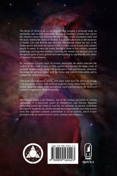The Book of Orion is an occult grimoire that presents a profound study on spirituality and ancient symbolism through an initiatory formula that echoes the timeless connection between the psychology of the incarnated mind and the many indefinable layers of divinity. It is an intricate work on the mysteries of Death, Life and Rebirth that develops the premise where the key to the hidden gnosis that holds the secrets of the Universe can be found in the subtlest details in nature. It takes the reader through a realm of lost cultures, encoded mythology and forgotten wisdom, exploring the mental and spiritual tools for the ageless quest of inner growth and understanding by touching the very fabric of immortal consciousness. By presenting a cryptic layer of Asetian philosophy the author educates the student of the occult in how to find, explore and interpret the many roads to personal enlightenment, along with its deceptive traps and illusions, ultimately liberating the spiritual seeker with the power and trust to look within and to conquer his own reality. Organized into three distinctive tomes of scholarly value, this work sheds light on the convoluted wisdom of old Israel known as the Kabbalah and how it connects with earlier Egyptian beliefs. It teaches the seeker about the formation of the Hebrew language so often explored in Western mysticism, the interpretation and use of the multilayered glyph of the Tree of Life, the fragmentation and transmutation of subtle energy explored in advanced metaphysical practice and the fundamental elements at the core of spiritual thought as studied in the mystery schools of past and present. It includes a compilation of different esoteric Libri developed by the author and of particular relevance to any contemporary occult curriculum, elaborating on the nature of initiation and its transformational properties, along with the detailed study of a powerful sigil and its complex layer of symbolism. This book conceals many secrets, and while some have the power to change your perception forever with renewed magickal clarity others hold the keys to hidden dungeons within your unconscious mind manifesting as the shadowed crafters of nightmares. Read it carefully... International author Luis Marques, one of the leading specialists in Asetian spirituality, is a renowned expert in metaphysics and Ancient Egyptian knowledge within the Order of Aset Ka. An authority on ancient symbolism and esoteric mysteries, he unveils through these pages another profound literary work that expresses a serious commitment to occult wisdom, which is here presented with an unseen level of clarity, honesty and eloquence.