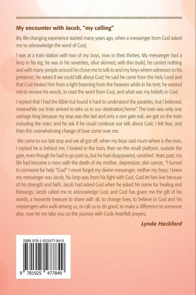 My encounter with Jacob, "my calling" My life changing experience started many years ago, when a messenger from God asked me to acknowledge the word of God; I was at a train station with two of my boys, now in their thirties; My messenger had a limp in his leg, he was in his seventies, olive skinned, with thin build, he carried nothing and with many people around he chose me to talk to and my boys where witnesses to his presence; He asked if we could talk about God; he said he came from the Holy Land and that God healed him from a light beaming from the heavens while in his tent; he wanted me to receive his words, to read the word from God, and what was my beliefs in God. I replied that I had the Bible but found it hard to understand the parables; but I believed; meanwhile our train arrived to take us to our destination,home" The train was only one carriage long because my stop was the last and only a one gate exit; we got on the train including the man; and he ask if he could continue our talk about God; I felt fear, and then this overwhelming change of love come over me. We came to our last stop and we all got off, when my boys said mum where is the man, I replied he is behind me, I looked in the train, then on the small platform, outside the gate, even though he had to go past us, but he had disappeared, vanished. Years past; my life had become a mess with the death of my mother, depression, skin cancer, "I turned to someone for help "God" I never forgot my divine messenger, neither my boys; I knew my messenger was Jacob, his limp was from his fight with God, God let him live because of his strength and faith, Jacob had asked God when he asked his name for healing and blessings; Jacob called me to acknowledge God, and God has given me the gift of his words, a heavenly treasure to share with all, to change lives, to believe in God and his messengers who walk among us, to call us to do good, to make a difference to someone else, now let me take you on the journey with Gods heartfelt prayers.