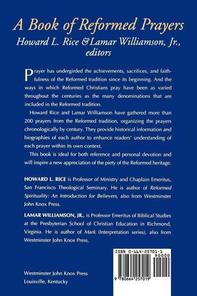 Prayer has undergirded the achievements, sacrifices, and faithfulness of the Reformed tradition since its beginning. And the ways in which Reformed Christians pray have been as varied throughout the centuries as the many denominations that are included in the Reformed tradition. Howard Rice and Lamar Williamson have gathered more than 200 prayers from the Reformed tradition, organizing the prayers chronologically by century. They provide historical information and biographies of each author to enhance readers' understanding of each prayer within its own context.