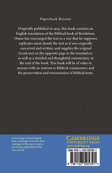 Originally published in 1923, this book contains an English translation of the biblical book of Revelation. Oman has rearranged the text in a way that he supposes replicates most closely the text as it was originally conceived and written, and supplies the original Greek text on the opposite page to the translation, as well as a detailed and thoughtful commentary at the end of the book. This book will be of value to anyone with an interest in biblical commentary and the preservation and transmission of biblical texts.