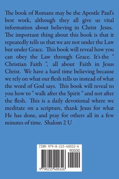 The book of Romans may be the Apostle Paul's best work, although they all give us vital information about believing in Christ Jesus. The important thing about this book is that it repeatedly tells us that we are not under the Law but under Grace. This book will reveal how you can obey the Law through Grace. It's the " Christian Faith ", all about Faith in Jesus Christ. We have a hard time believing because we rely on what our flesh tells us instead of what the word of God says. This book will reveal to you how to " walk after the Spirit " and not after the flesh. This is a daily devotional where we meditate on a scripture, thank Jesus for what He has done, and pray for others all in a few minutes of time. Shalom 2 U